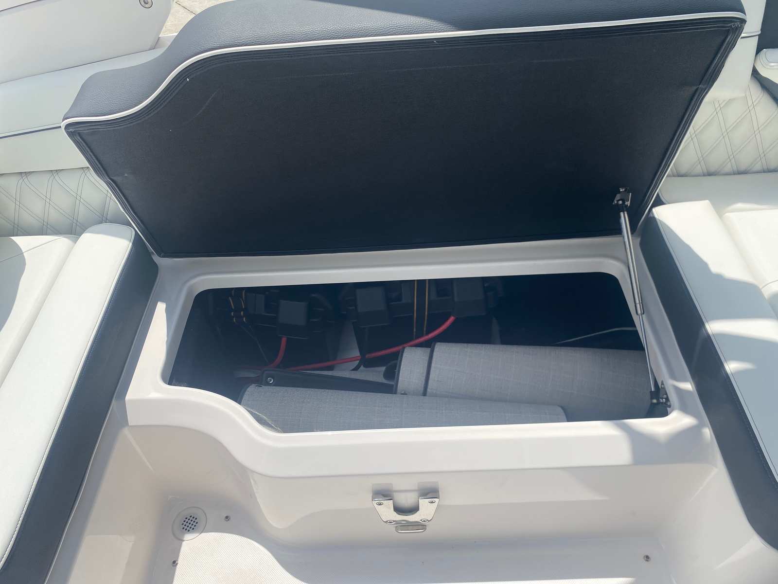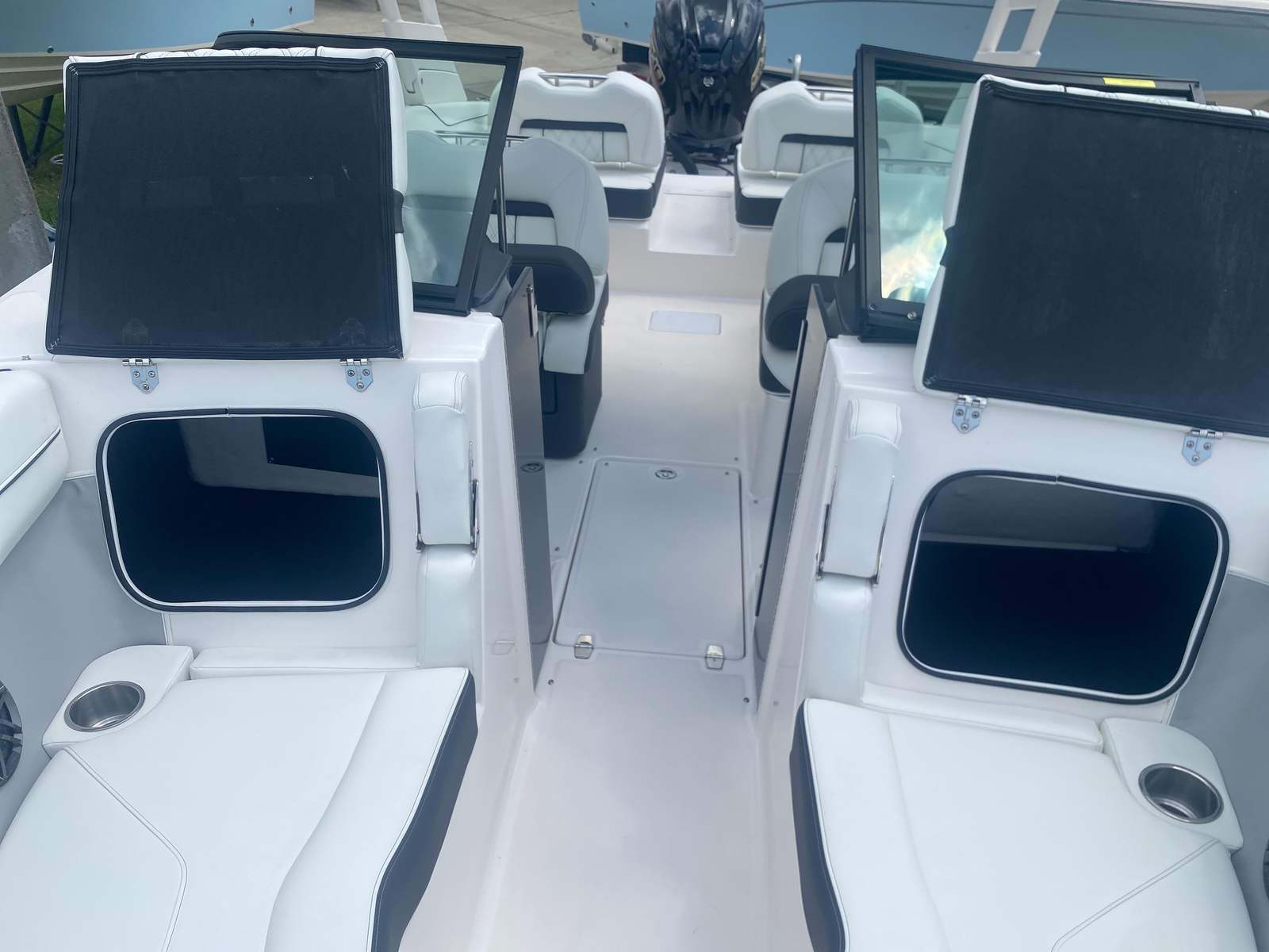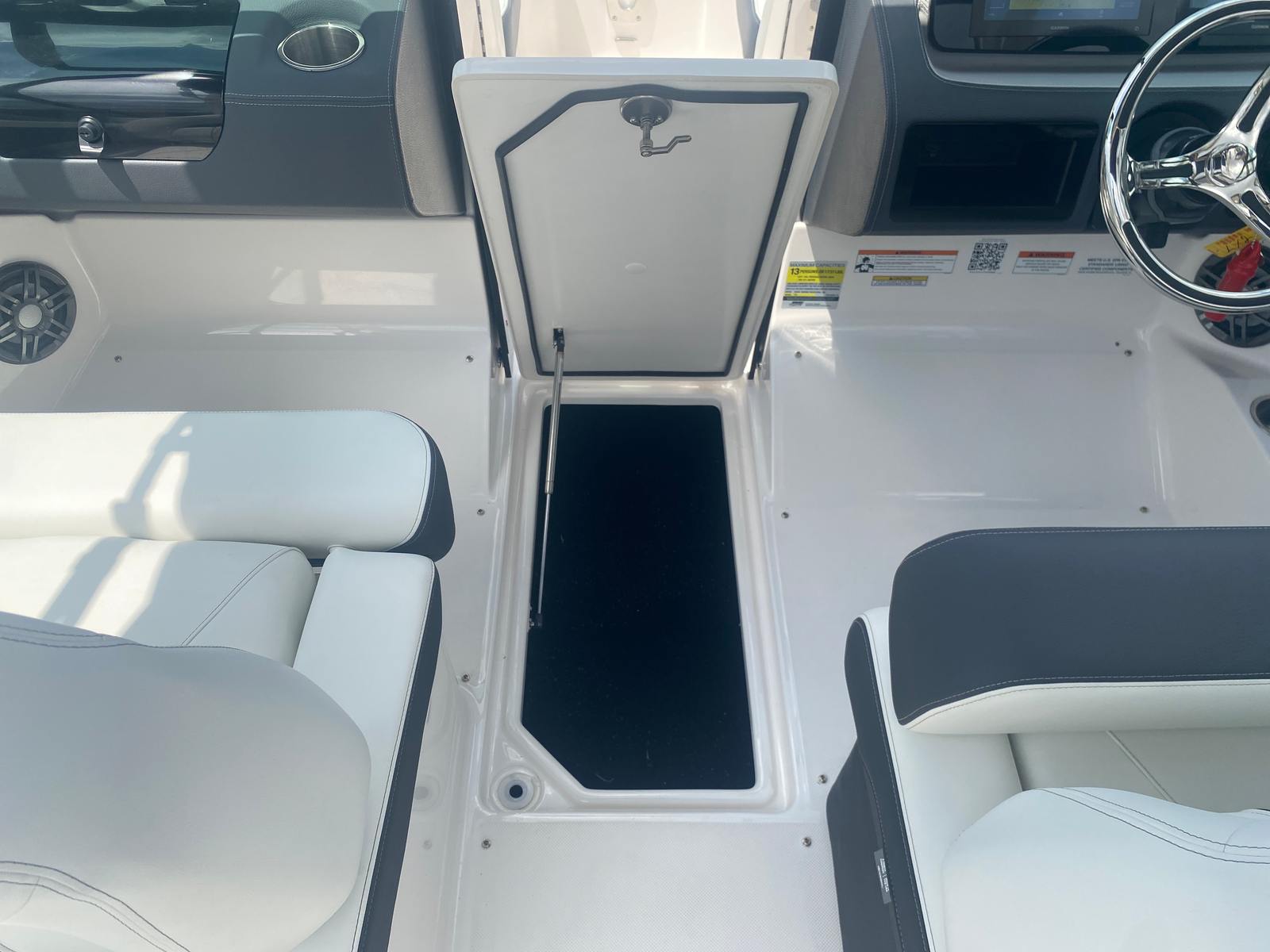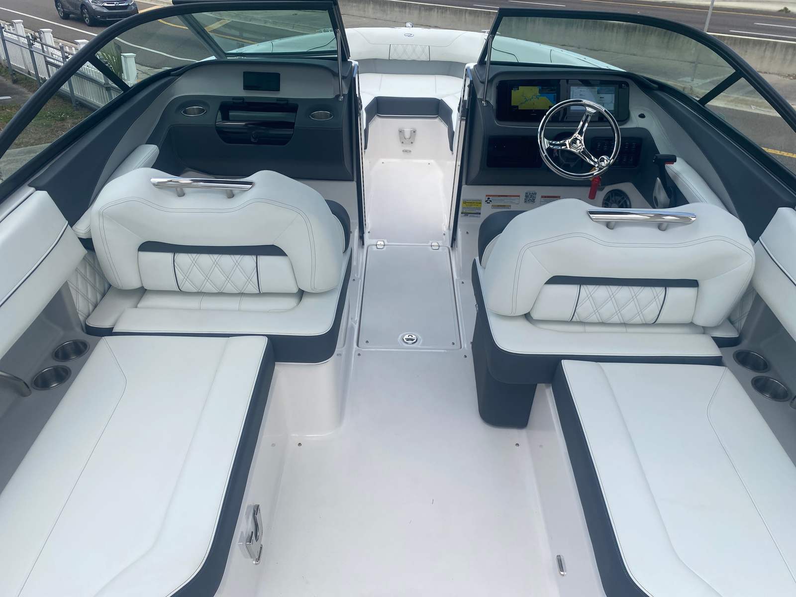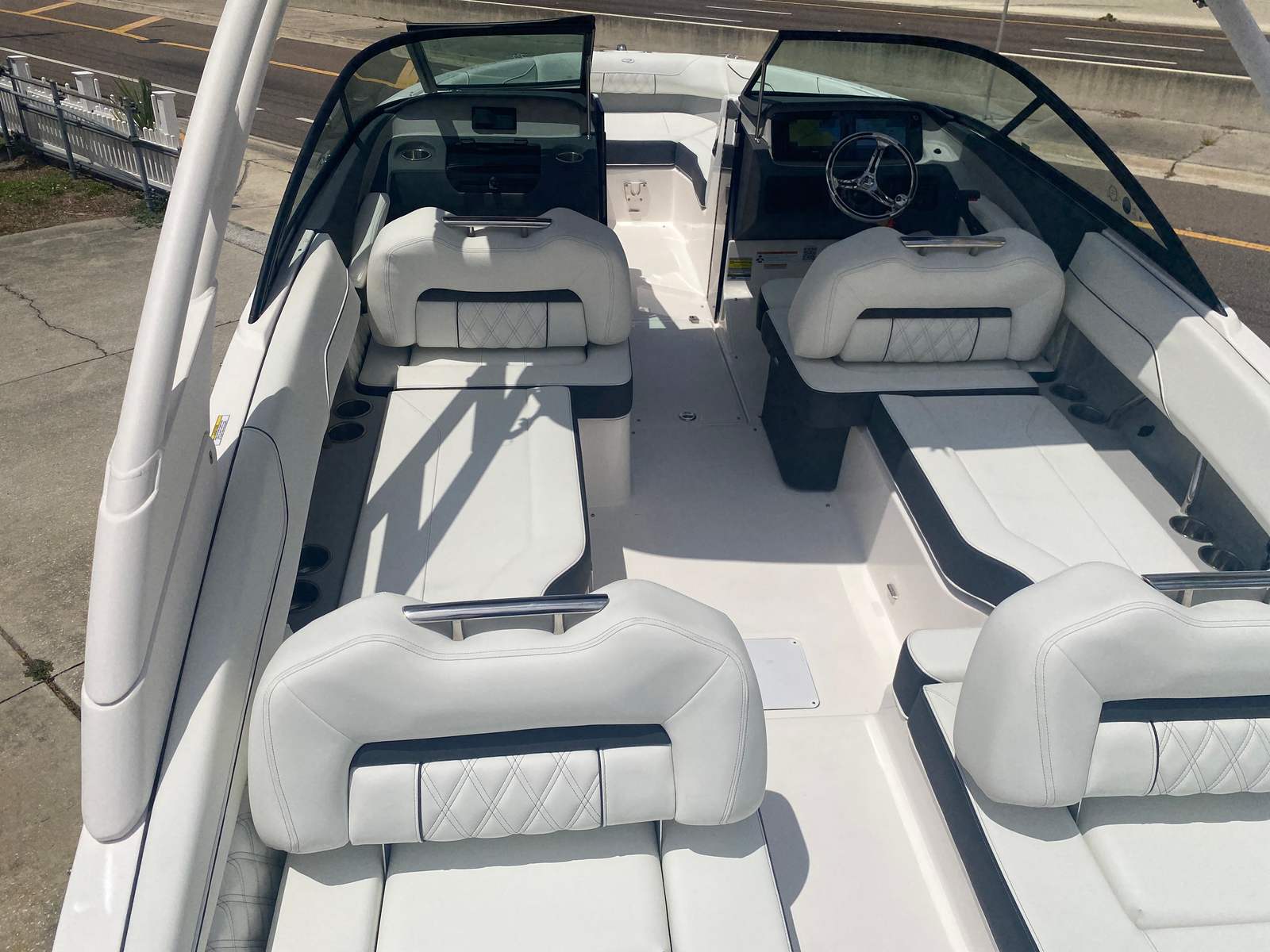 The Regal LX2 is packed with special features designed to enhance your boating experience. The Yamaha VF200XB engine is renowned for its reliability and efficiency, offering peace of mind and consistent performance. Power assisted hydraulic steering adds a layer of convenience, making maneuvering the boat a breeze even in challenging conditions.For those who appreciate comfort and convenience, the transom shower and pressure water package provide a refreshing way to rinse off after a swim or a day of water sports. The bow filler cushion transforms the forward seating area into a spacious sun pad, perfect for lounging and soaking up the sun. The Mediterranean Blue hull and canvas not only add a touch of elegance but also ensure your boat stands out from the crowd.The PowerTower S2 in white is both stylish and functional, offering shade and support for water sports activities. Blue underwater lighting creates a captivating ambiance during evening cruises, while the teak cockpit table provides a sophisticated space for snacks, drinks, or games. Bow walk-thru doors enhance safety and accessibility, making it easy to move between the bow and cockpit areas.