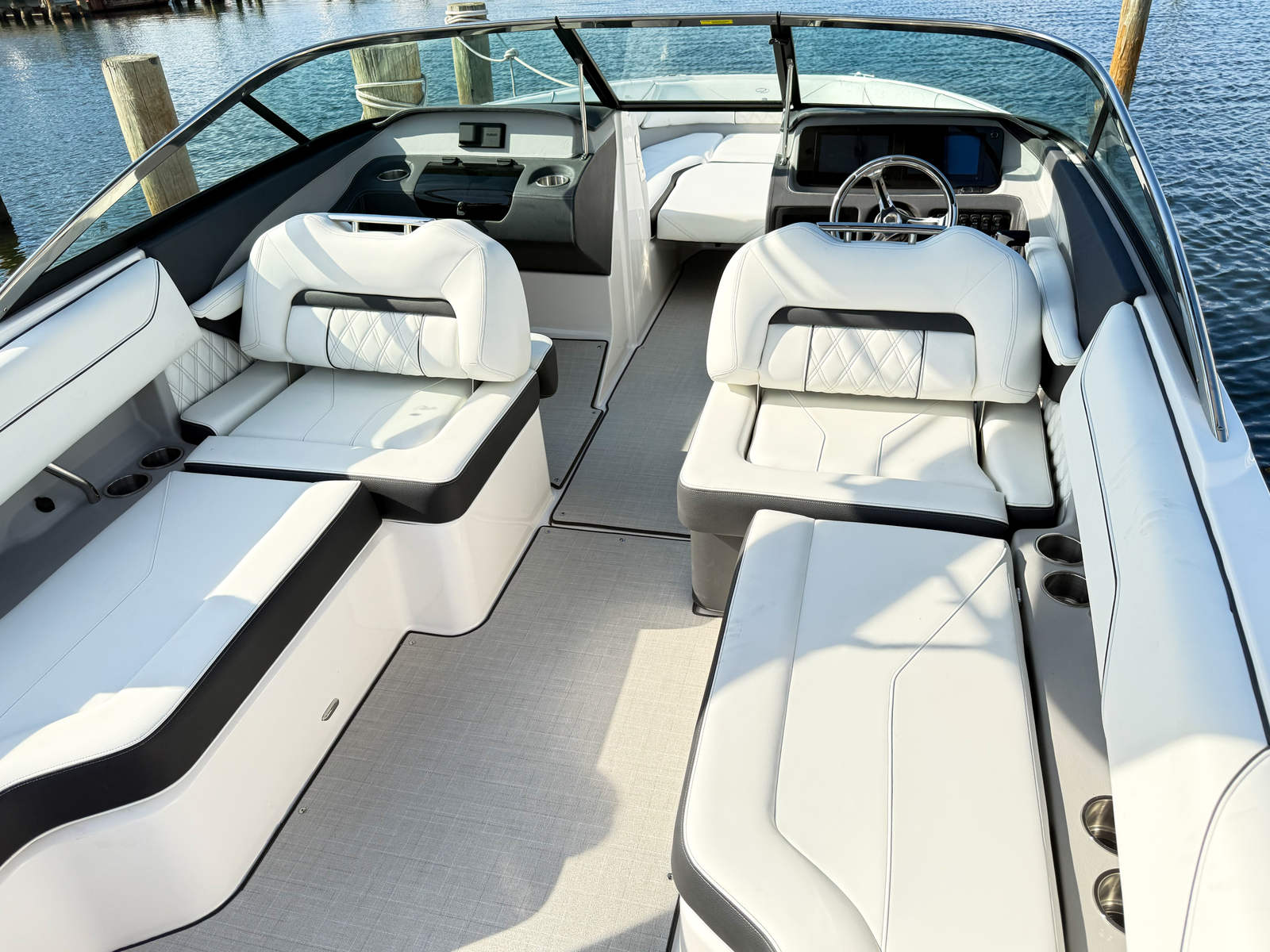 The Regal LX4 Bowrider is packed with premium features designed to elevate your boating experience. The Dual Battery Switch with Tray and Cables ensures reliable power management, so you can enjoy extended days on the water without worry. Docking Lights make evening arrivals and departures safer and more convenient, while the Water Sport Tow Pylon is perfect for wakeboarding, tubing, or skiing adventures. The Cockpit Seagrass Mat adds a touch of luxury and comfort underfoot, creating a welcoming atmosphere for guests.For those who appreciate high-quality entertainment, the Stereo Performance & Lighting Package delivers immersive sound and vibrant lighting, setting the mood for any occasion. The Bow Filler Cushion transforms the bow area into a spacious lounge, ideal for sunbathing or socializing. The innovative PowerTower in White provides easy storage for water sports equipment and offers shade when needed. Fender Clips simplify the process of securing your boat at the dock, ensuring quick and hassle-free mooring.