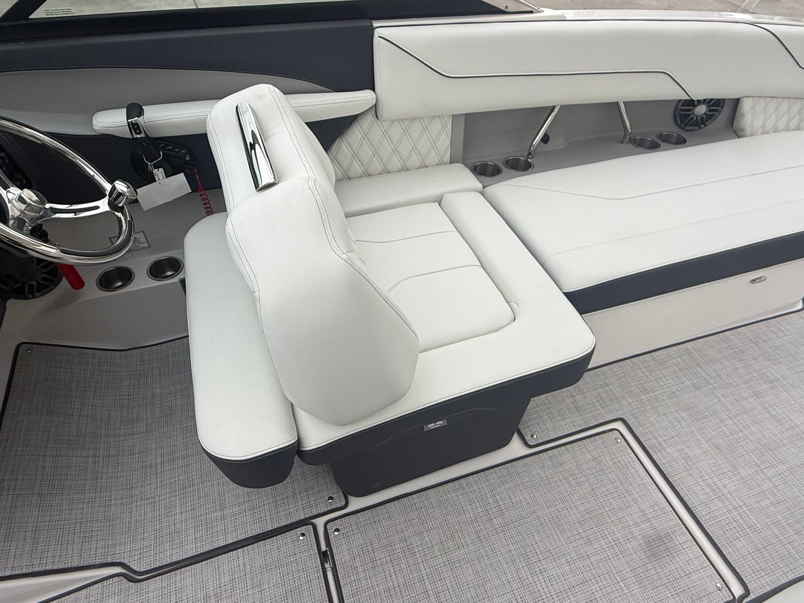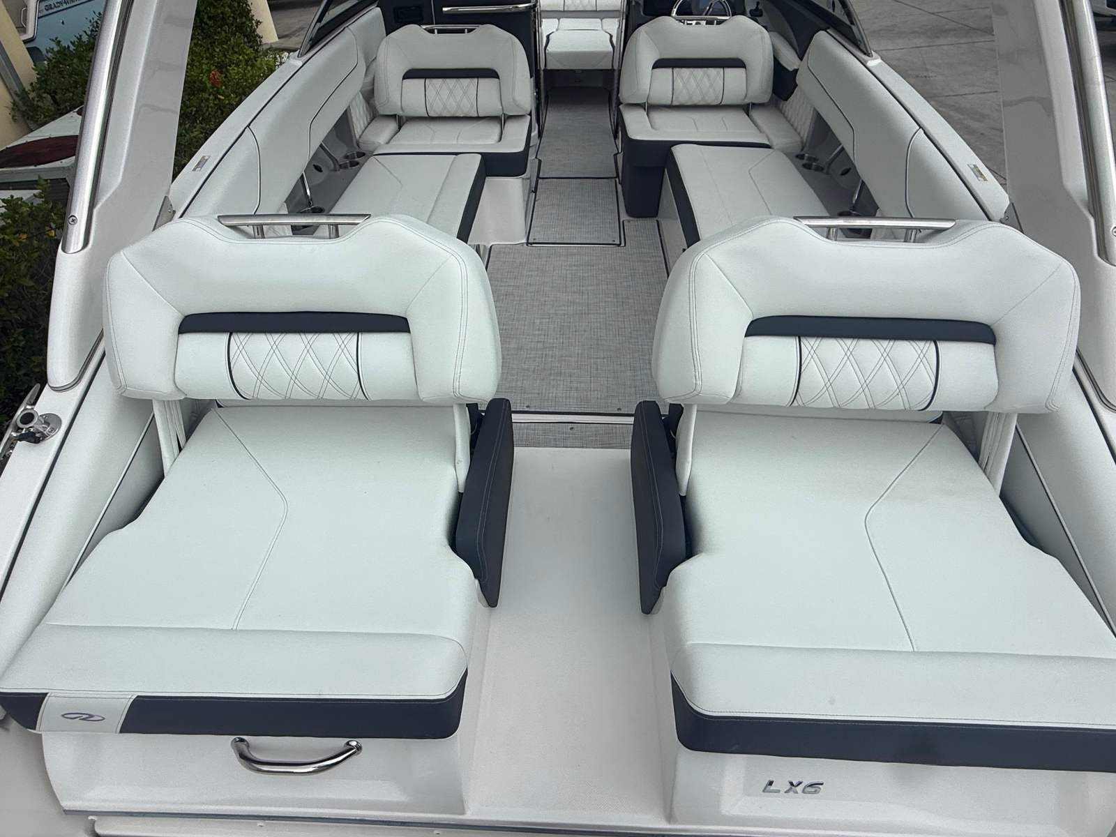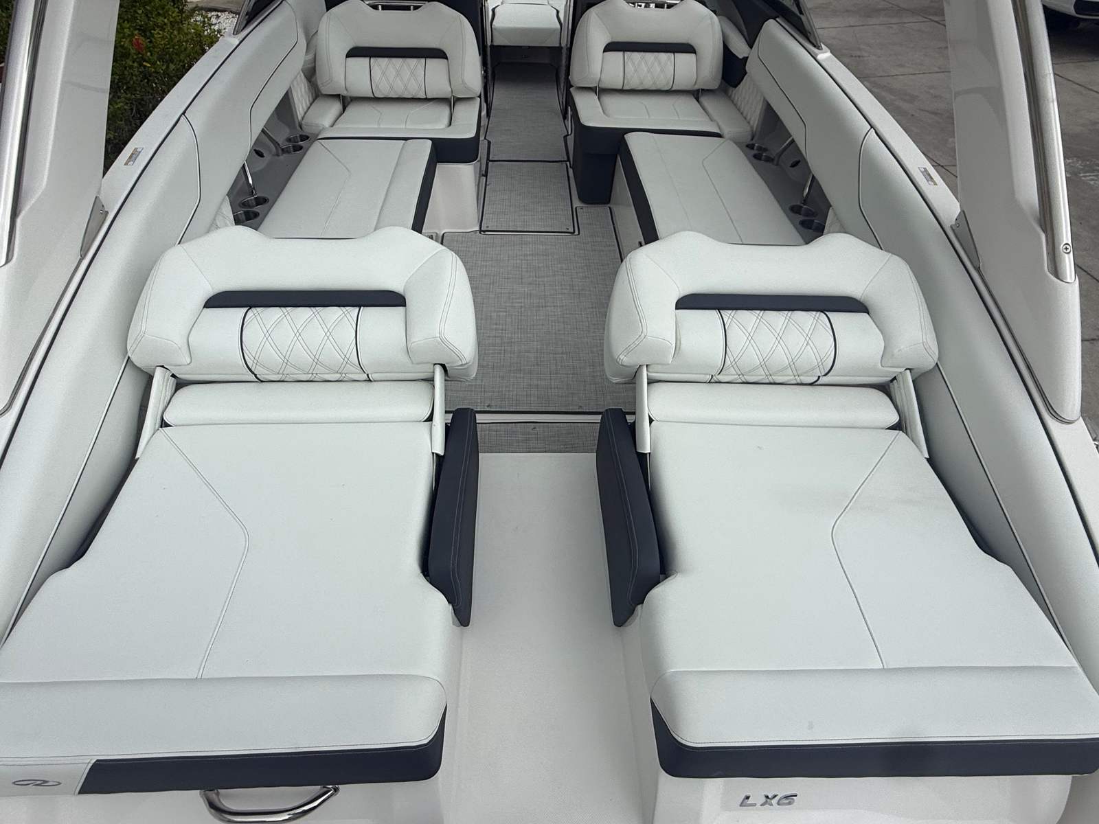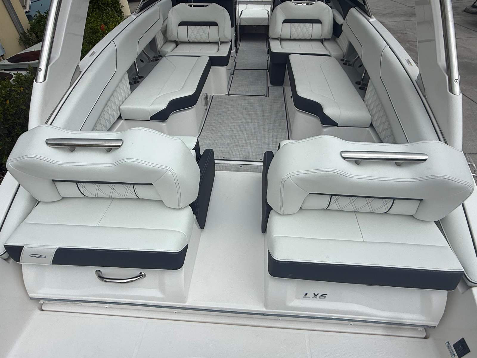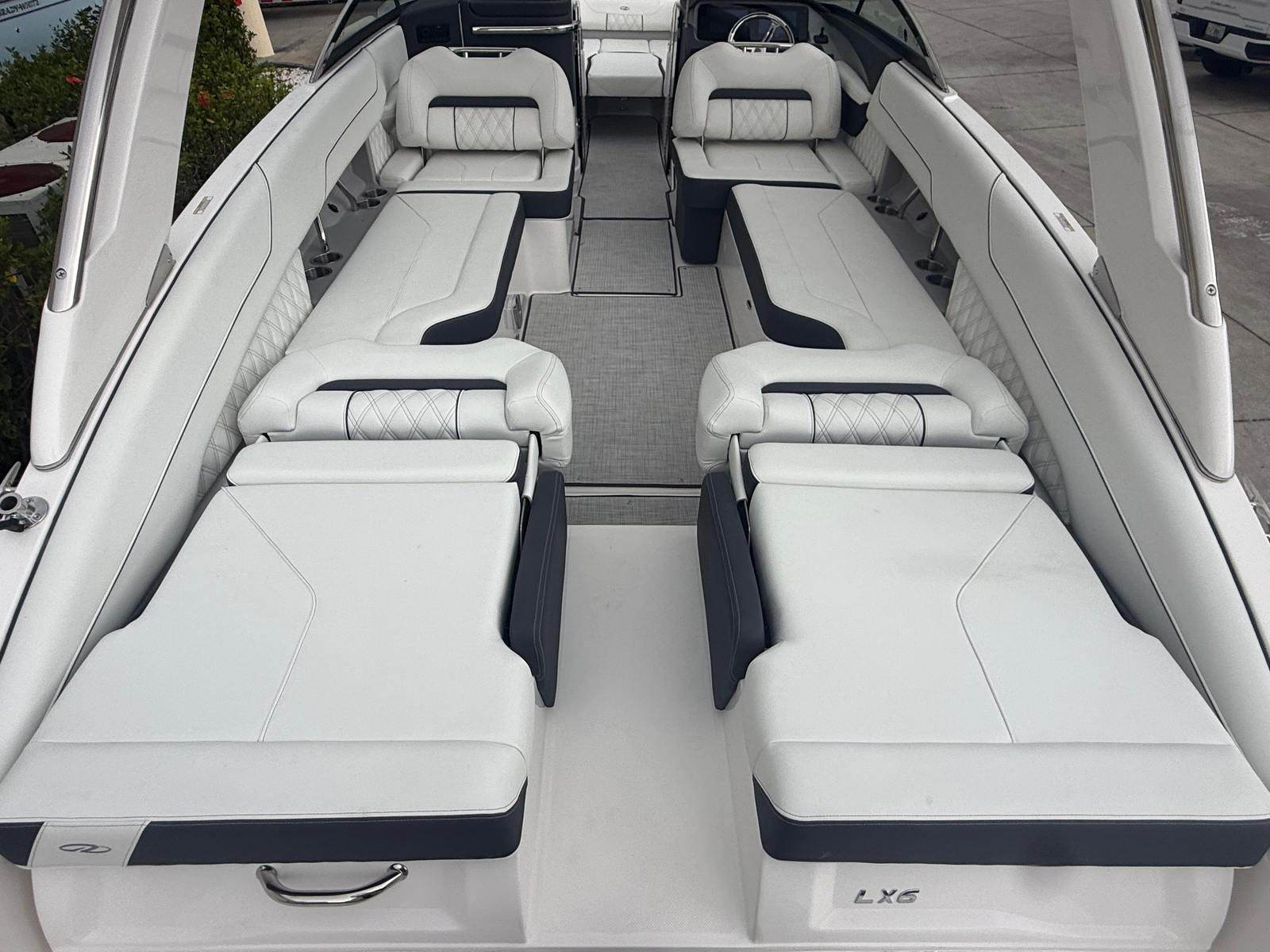 Beyond its impressive performance and luxurious features, the Regal LX6 is designed with practicality in mind. The dual battery system ensures that you have reliable power for extended outings, while the battery charger keeps everything running smoothly. The bow thruster simplifies docking and maneuvering in marinas, making it easy for boaters of all experience levels to handle the LX6 with confidence.The cockpit seagrass mat not only enhances comfort but also makes cleaning and maintenance a breeze. The bow and cockpit covers protect your investment from sun and weather, preserving the boat’s appearance and value. With the trim tabs, you can easily adjust the boat’s attitude for optimal fuel efficiency and ride comfort, ensuring that every trip is as enjoyable as possible.
