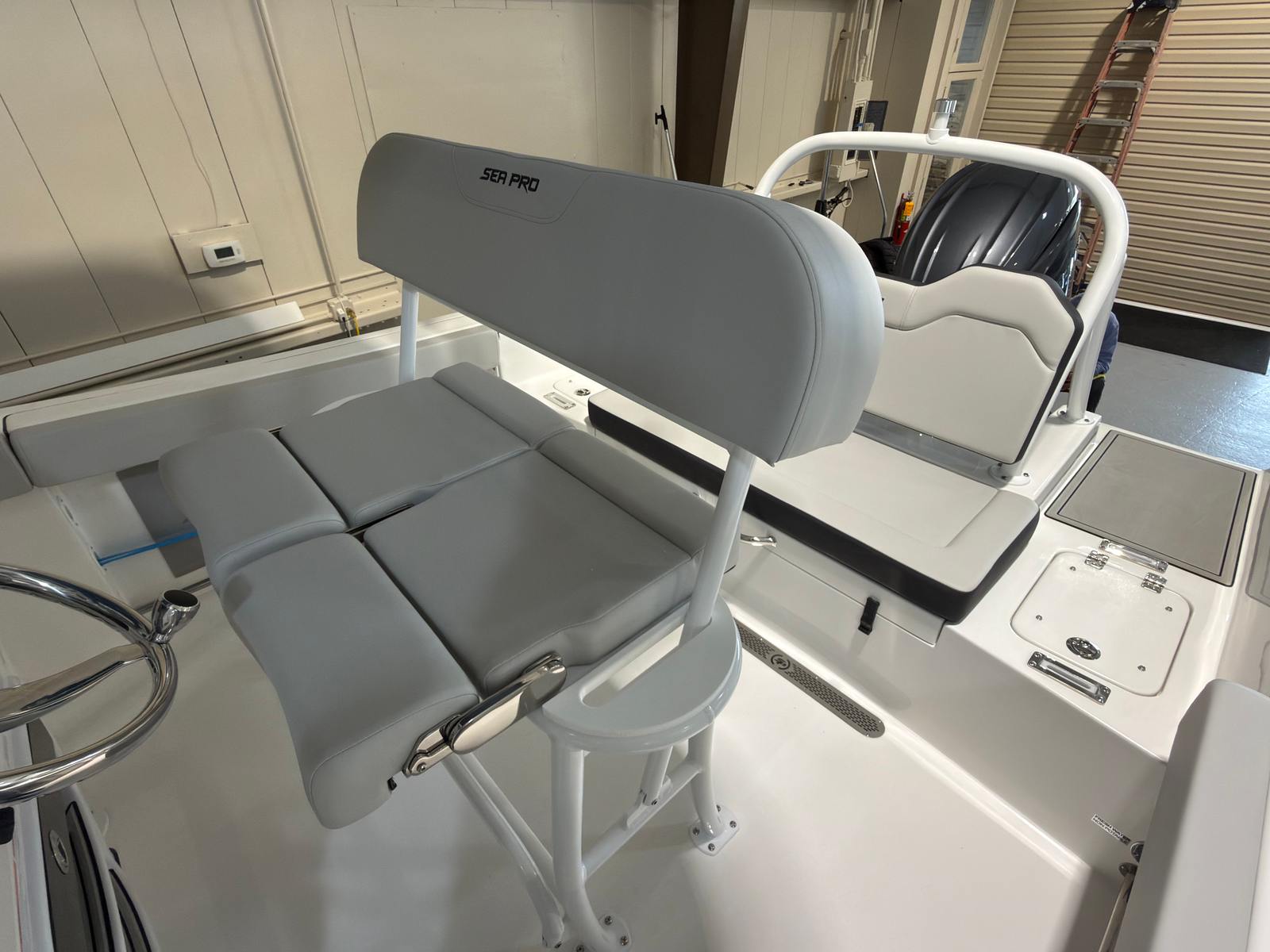 The Sea Pro 225 Flxr is loaded with special features that enhance both functionality and comfort. Communication and safety are prioritized with the VHF Radio RS20, allowing you to stay connected while on the water. The hull and deck are equipped with a fresh water wash down and sink, making it easy to clean up after a day of fishing or water sports. Four stainless steel cup/rod holders provide convenient storage for beverages and fishing gear, ensuring that everything you need is always within reach.A fiberglass hard top T-top offers superior protection from the sun and elements, while the white powder coat finish adds a touch of elegance and durability. The helm is outfitted with a wireless phone charger and holder, keeping your devices powered and secure throughout your journey. For those sunny days when you want extra shade, the sun shade bow (including two rod holders) provides a comfortable retreat at the front of the boat. The underside of the T-top features a beautiful Carolina Blue color, complementing the crisp white upholstery for a fresh, modern look.