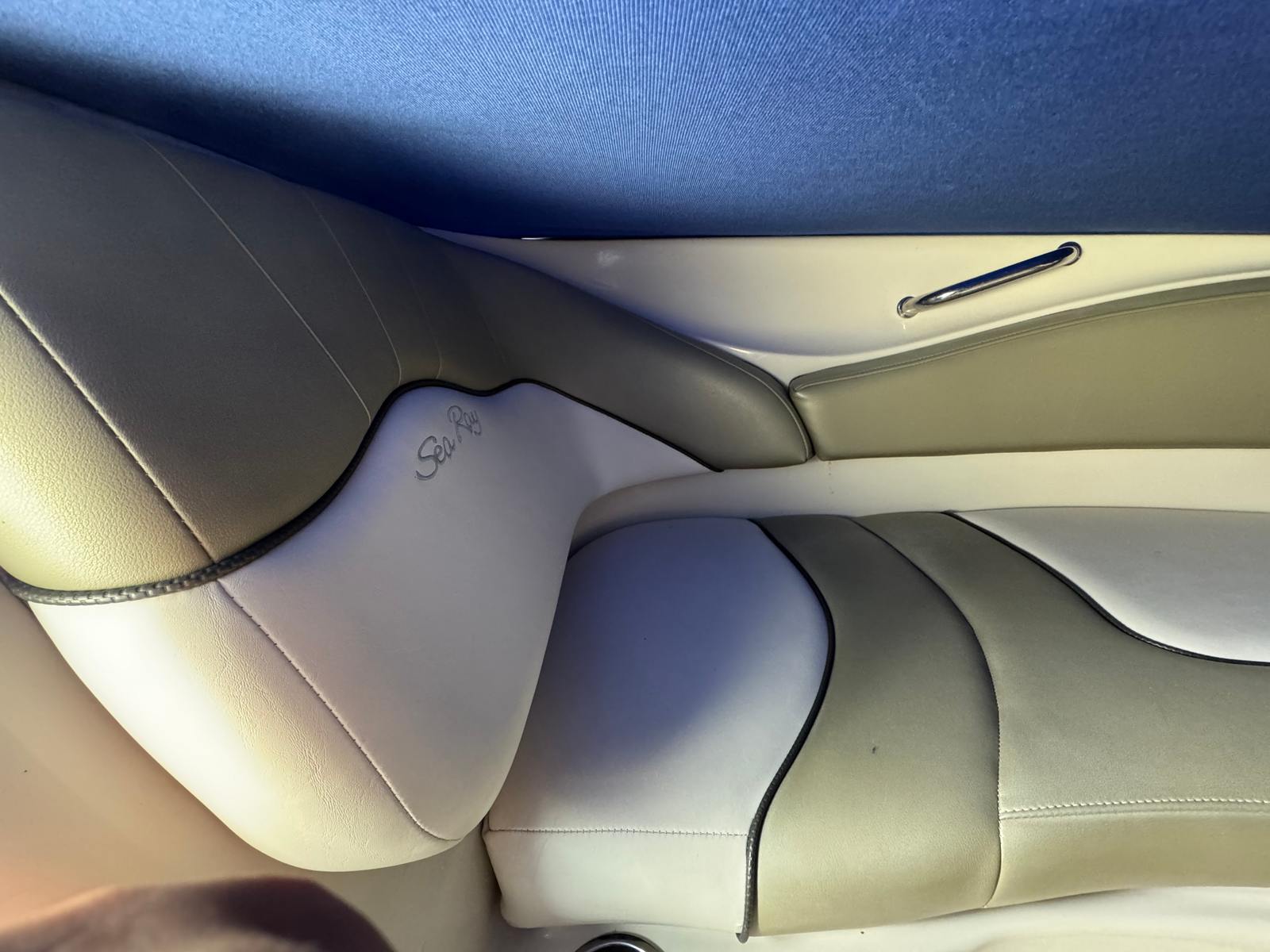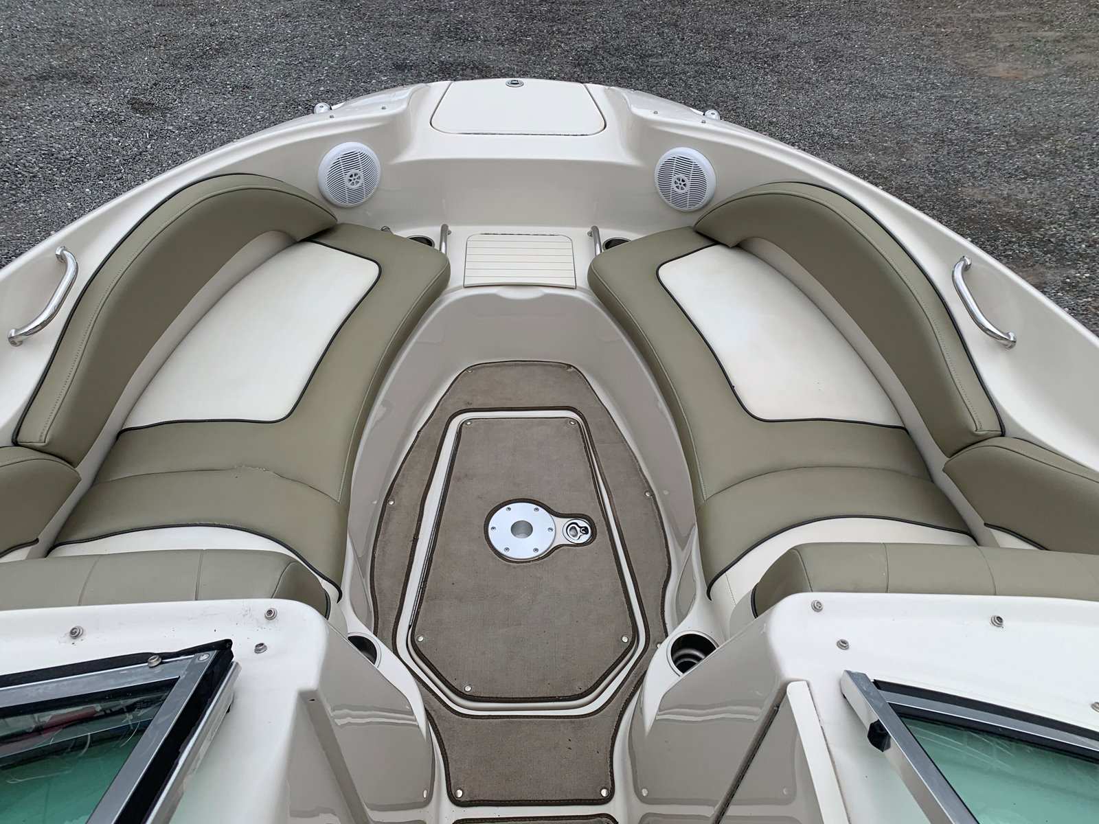 The 220 Sundeck makes room for 10 riders to stretch out in the lounge seating. The bow seating has its own boarding ladder and shower, and room for the table to set up when needed. The cockpit has L-shaped seating as well as a bolstered Captain's chair. Access to the head is in the privacy compartment in front of the passenger seat.