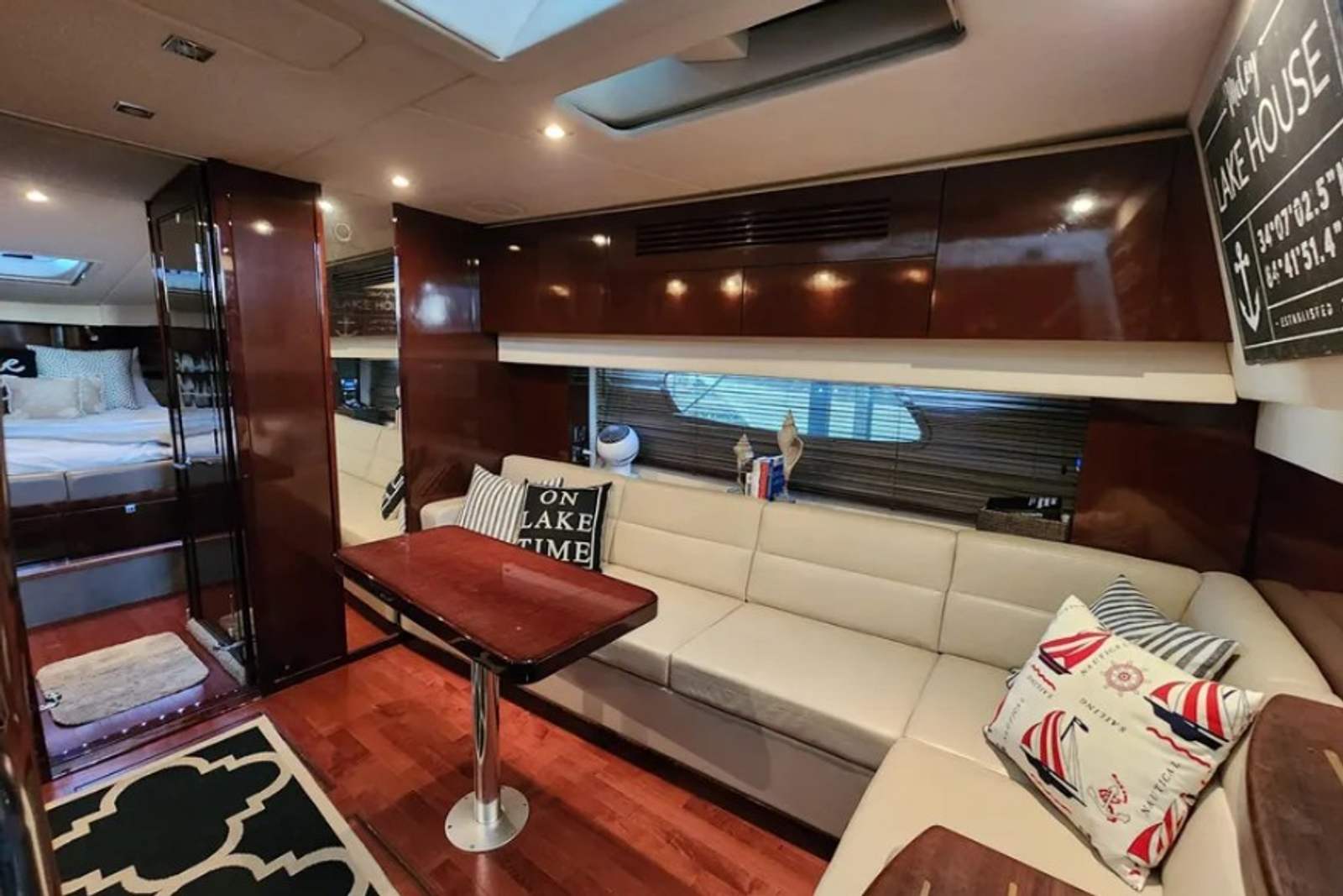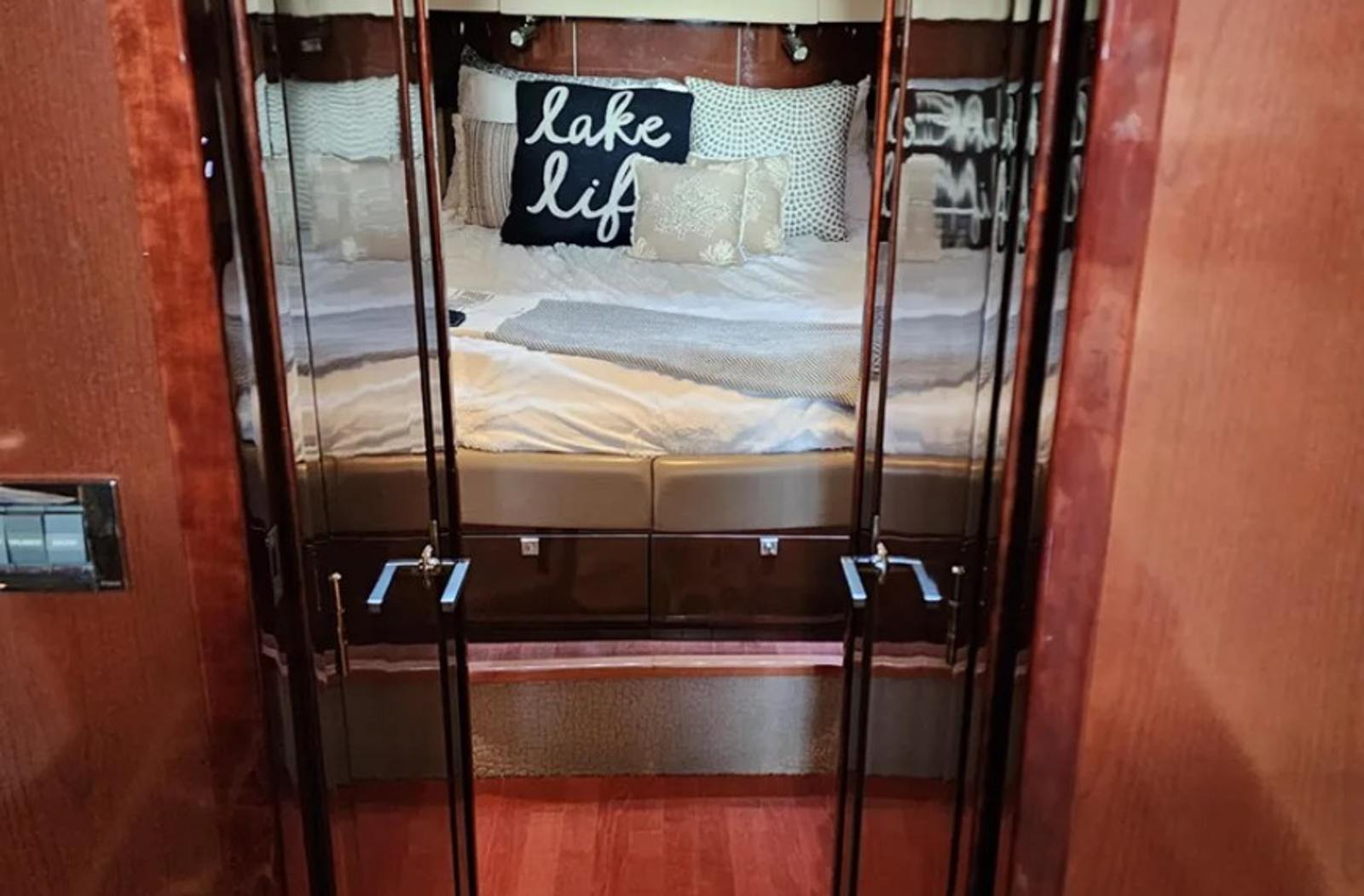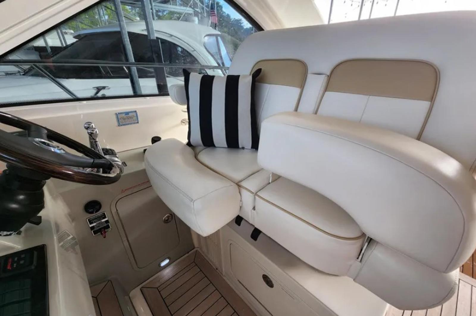 Powered by twin Cummins QSB 480 diesel engines with pod drives, this Sundancer delivers confident performance and remarkable joystick maneuverability, especially in tight spaces or while docking. Both pods have been recently serviced. The engines have approximately 800 hours, and the 15kW Onan generator has around 600 hours, with recent service completed. The boat has also been buffed and waxed on all fiberglass surfaces.