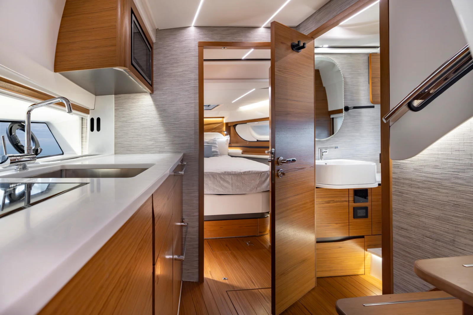 The Tiara Yachts 39 LE is as practical as it is luxurious. The Mercury® Integrated Bow Thruster System simplifies docking, making it accessible even for those new to yacht ownership. The all-chain windlass with remote control adds another layer of convenience, allowing for quick and secure anchoring. The oil changer for the generator reduces maintenance time, so you can focus on making memories instead of managing routine tasks.The synthetic teak decking not only enhances the yacht’s aesthetic appeal but also provides a durable, easy-to-clean surface that stands up to the demands of active boating. The refrigerator and cockpit TV in the wet bar area add to the yacht’s versatility, making it ideal for everything from casual day trips to extended cruises.