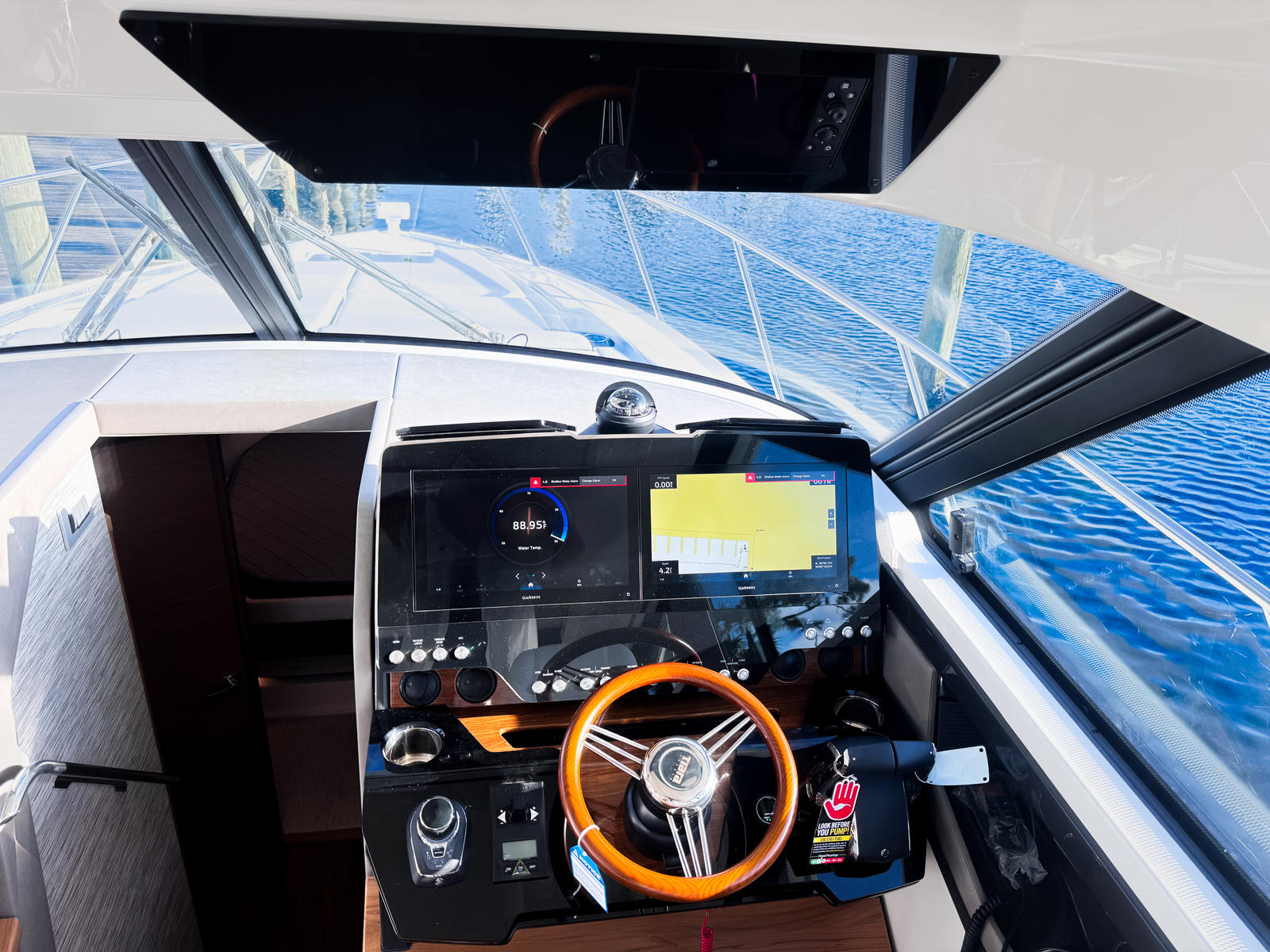 The 2025 Tiara Yachts 43 LE is packed with premium features that set it apart from other yacht boats for sale. The Seakeeper SK6 Gyro stabilizer ensures a remarkably smooth experience on the water by minimizing roll, providing unmatched comfort for you and your guests. The electric fold-down antennas and navigation light offer convenience and a streamlined profile, while the Garmin 48" Fantom Open Array Radar and additional Garmin 16" display deliver cutting-edge navigation and situational awareness.For those who appreciate luxury finishes, the yacht boasts a teak steering wheel in lieu of the standard option, and solid surface interior and exterior finishes in Aurora Andria, creating a refined and inviting atmosphere. Entertaining is effortless with the refrigerated cooler box and freezer with ice maker, ensuring your favorite refreshments are always at hand. The aft-facing seat provides a perfect spot to relax and take in the views, whether you are anchored in a quiet cove or cruising with friends.