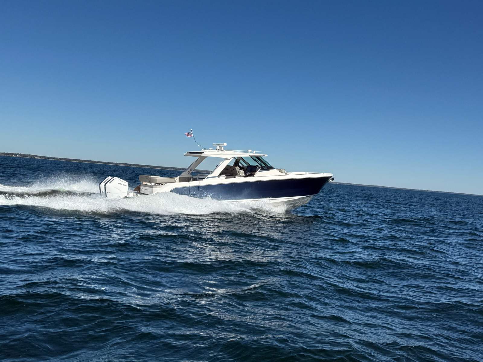 yacht with no wait time. Powered by twin Mercury 600hp V12 outboards with less than 80 hours, this vessel offers