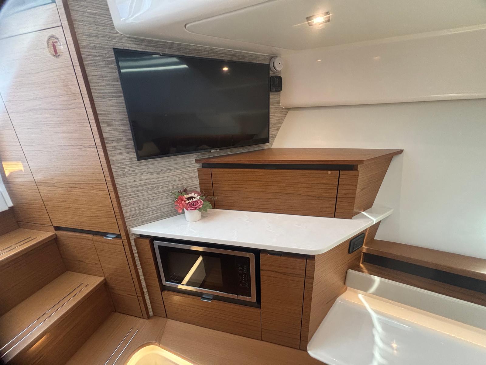 The Tiara Yachts 48 LS is designed with practicality in mind, making ownership as enjoyable as it is effortless. The yacht’s advanced joystick piloting system simplifies docking and maneuvering, even in crowded marinas or tight slips. The electric fold-down antenna and navigation light make it easy to adjust your clearance for bridges or storage, while the macerator ensures hassle-free waste management during extended trips.The remote hardtop and spotlight add to the yacht’s versatility, allowing you to adapt to changing weather conditions or enjoy nighttime cruising with ease. The solid surface LG Aurora Frost materials are not only stylish but also easy to clean and maintain, ensuring your yacht looks pristine with minimal effort. With ample storage throughout the vessel, you can bring along all the gear, provisions, and comforts you need for a perfect day or weekend on the water.