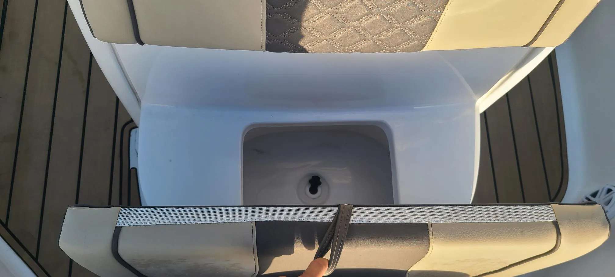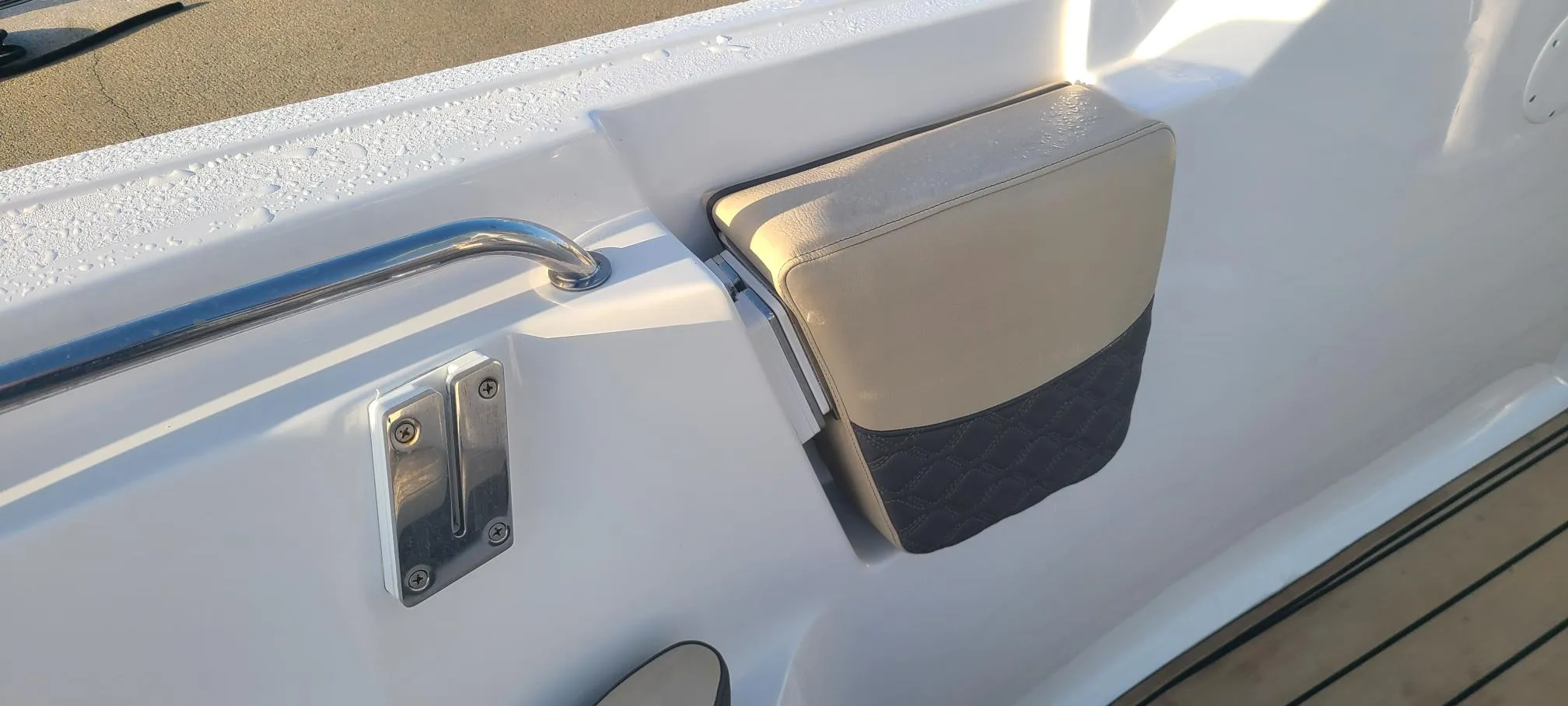 Cockpit Bolsters, Custom Hinged Bow Backrest (Pair), Fold-Down Rear Seat, Port and Starboard Bow Cushions, Console with Companion Footrest & Black Dash Panel